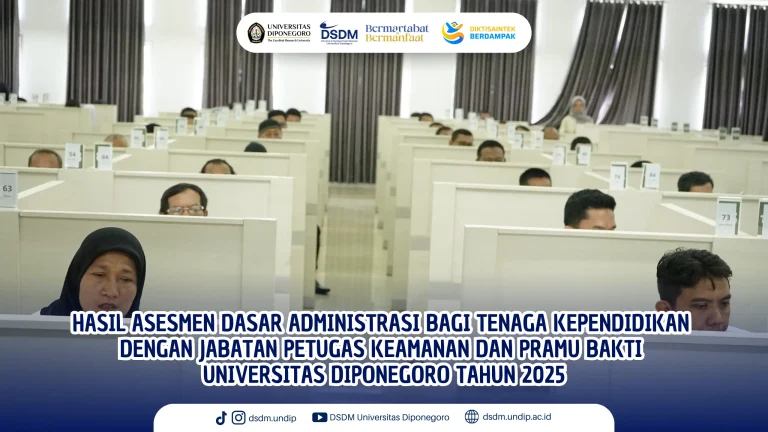 Berdasarkan hasil Asesmen Dasar Administrasi bagi Tenaga Kependidikan dengan jabatan Petugas Keamanan dan Pramu Bakti Universitas Diponegoro (Undip) Tahun 2025,...