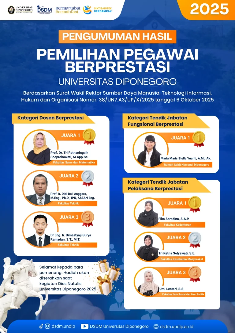 Universitas Diponegoro melalui Direktorat Sumber Daya Manusia (DSDM) menyampaikan hasil Pemilihan Pegawai Berprestasi Tahun 2025 bagi Pegawai Tetap di lingkungan...