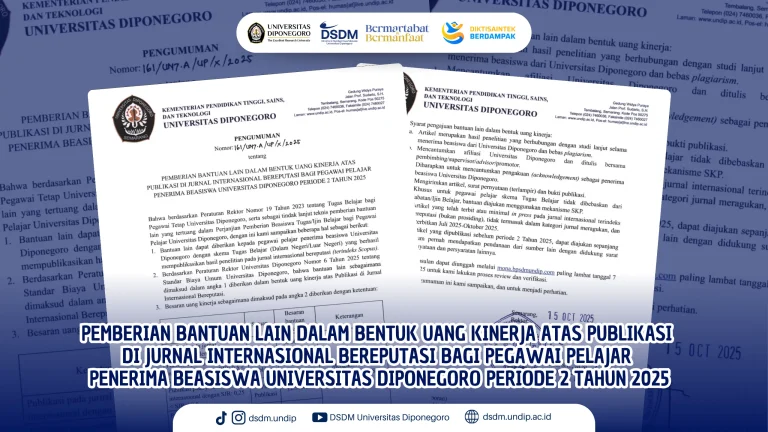 Dalam rangka mendorong peningkatan produktivitas publikasi ilmiah internasional, Universitas Diponegoro mengumumkan program Pemberian Bantuan Lain dalam Bentuk Uang Kinerja atas...