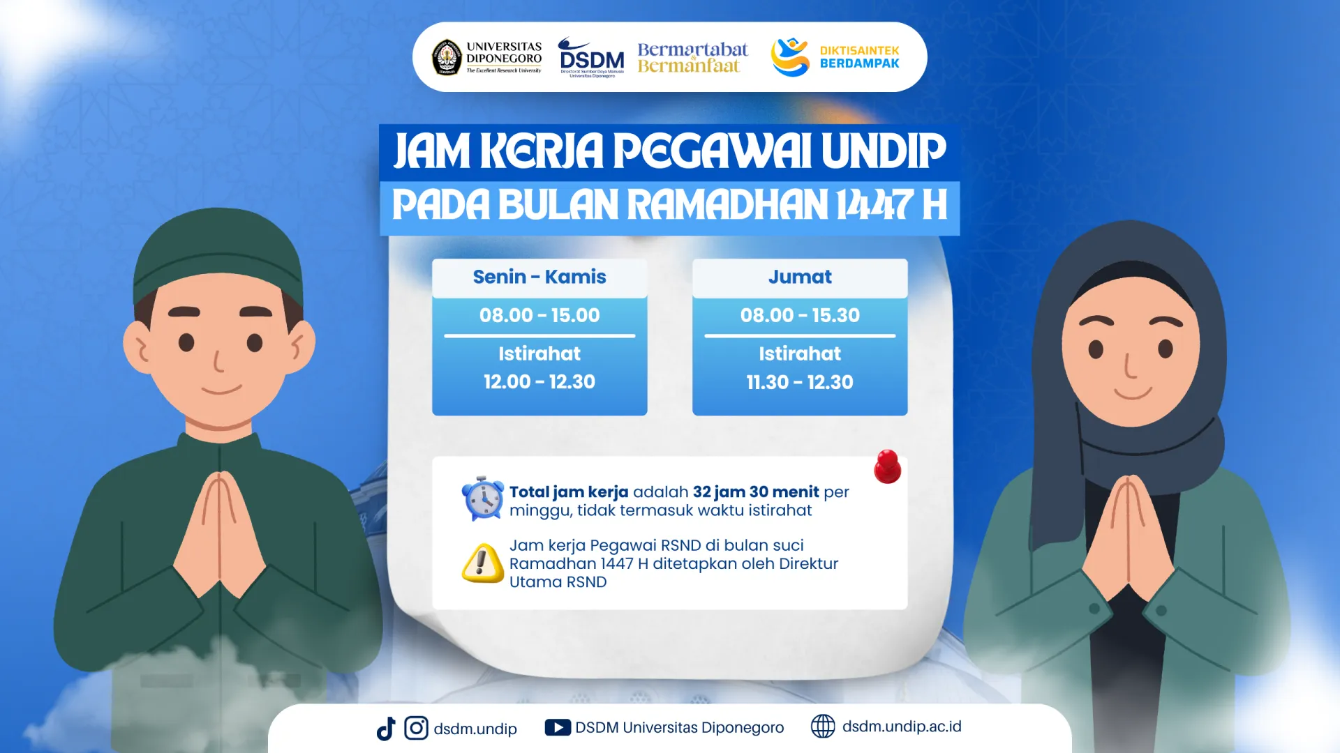 Selama bulan Ramadhan 1447 H, jam kerja pegawai ditetapkan sebanyak 32 jam 30 menit per minggu, dengan ketentuan sebagai berikut: