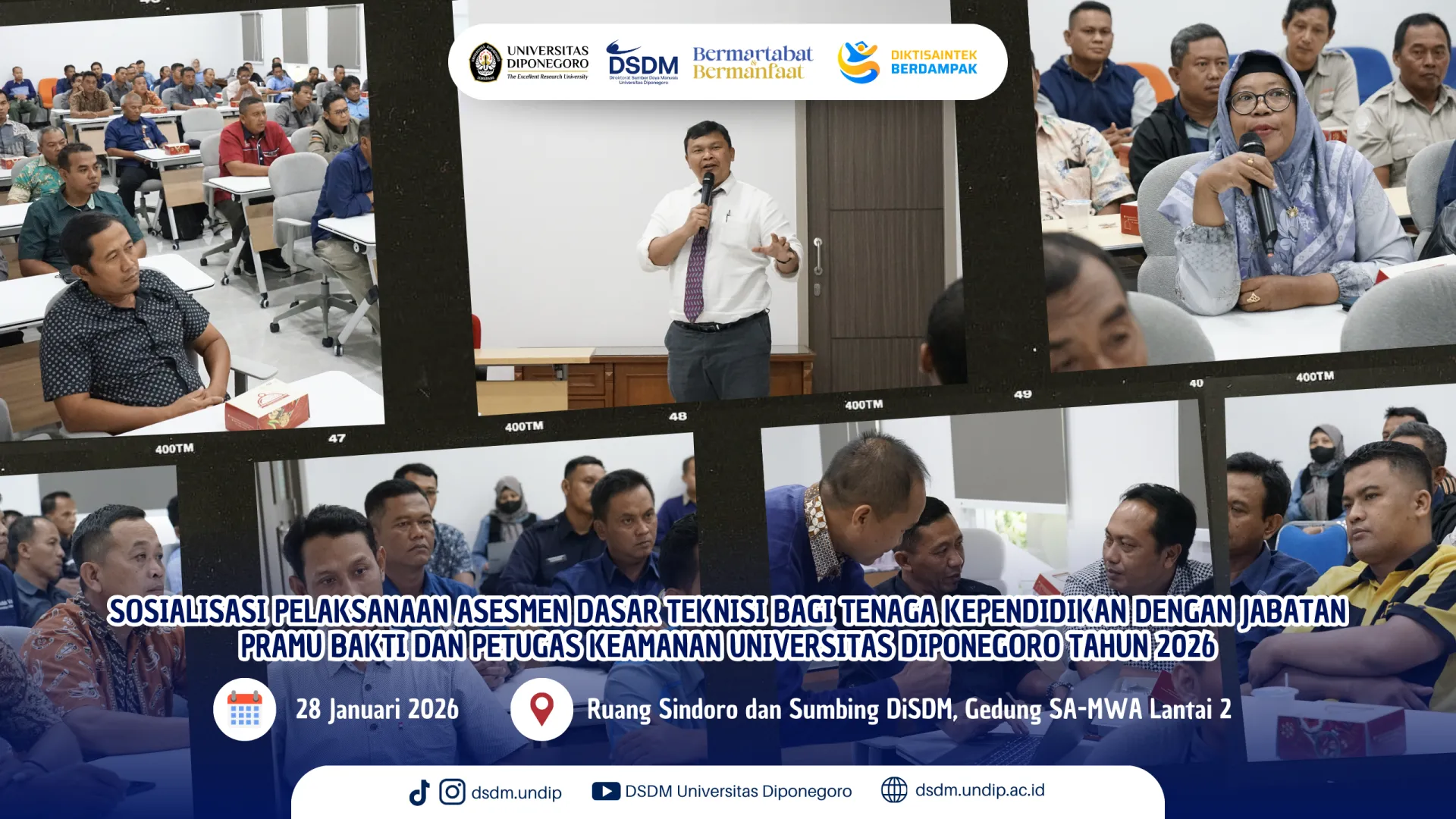 Universitas Diponegoro melalui Direktorat Sumber Daya Manusia (DSDM) menyelenggarakan kegiatan Sosialisasi Pelaksanaan Asesmen Dasar Teknisi bagi Tenaga Kependidikan dengan Jabatan Pramu Bakti dan Petugas Keamanan Universitas Diponegoro Tahun 2026. Kegiatan ini dilaksanakan pada Rabu, 28 Januari 2026 bertempat di Ruang Sindoro–Sumbing, Direktorat Sumber Daya Manusia, Gedung SA-MWA Lantai 2.