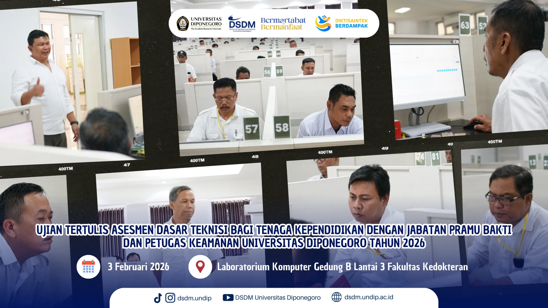 Universitas Diponegoro melalui Direktorat Sumber Daya Manusia (DSDM) menyelenggarakan Ujian Tertulis Asesmen Dasar Teknisi bagi tenaga kependidikan dengan jabatan pramu bakti dan petugas keamanan, pada Selasa, 3 Februari 2026, bertempat di Laboratorium Komputer Gedung B Lantai 3 Fakultas Kedokteran Universitas Diponegoro. Kegiatan ini diikuti oleh 104 peserta yang telah mendaftarkan diri untuk mengikuti jalur pengembangan karier sebagai teknisi di lingkungan Undip.