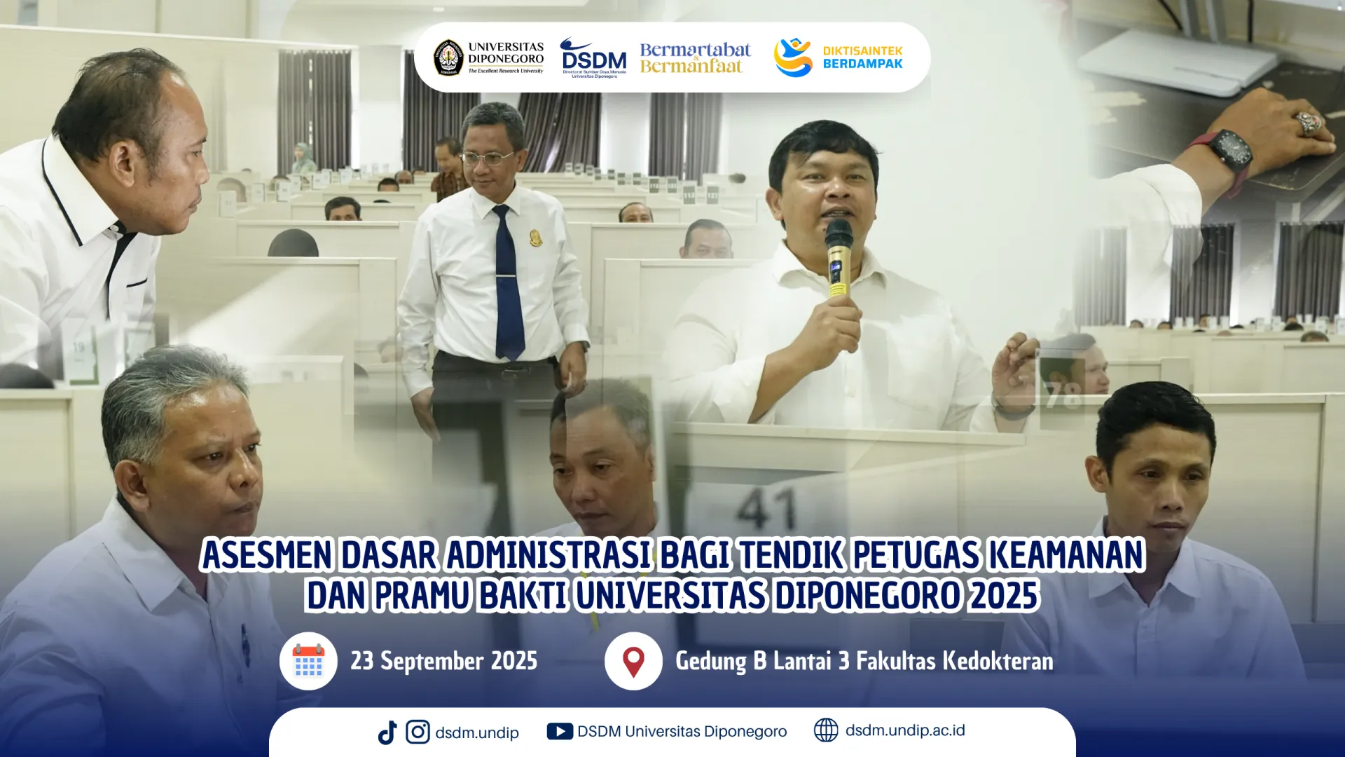 Universitas Diponegoro melalui Direktorat Sumber Daya Manusia (DSDM) menyelenggarakan kegiatan Asesmen Dasar Administrasi bagi tenaga kependidikan dengan tugas sebagai petugas keamanan dan pramu bakti, pada Senin, 22 September 2025, bertempat di Ruang Laboratorium Komputer, Gedung B Lantai 3, Fakultas Kedokteran Universitas Diponegoro.