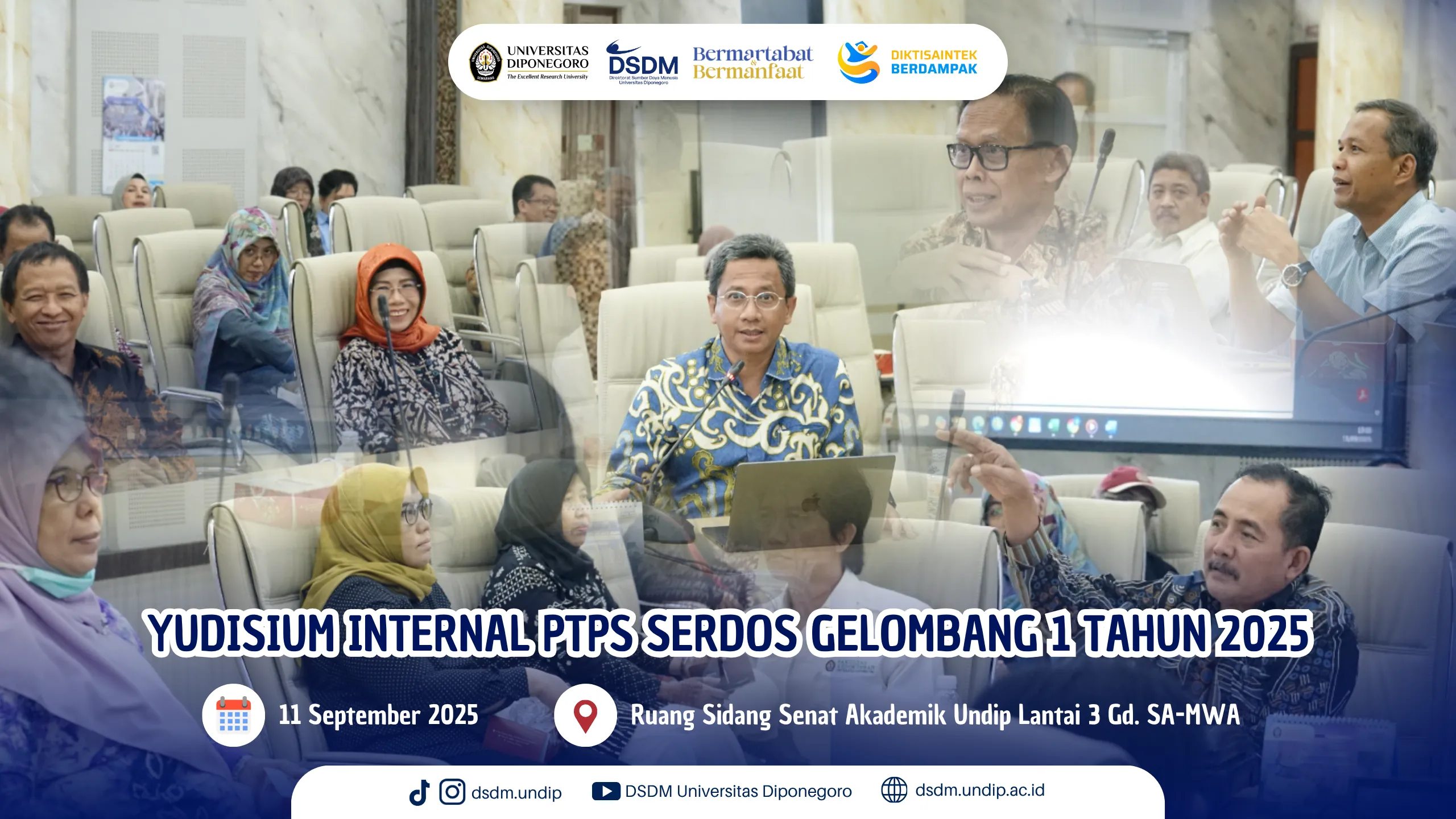 Universitas Diponegoro melalui Direktorat Sumber Daya Manusia menyelenggarakan Yudisium Internal Perguruan Tinggi Penyelenggara Sertifikasi Dosen (PTPS) Gelombang 1 Tahun 2025 pada Kamis, 11 September 2025. Kegiatan ini diikuti oleh 79 asesor sertifikasi dosen dari berbagai fakultas di lingkungan Universitas Diponegoro, dengan tujuan membahas dan menetapkan hasil akhir penilaian proses sertifikasi dosen (Serdos) gelombang pertama tahun ini.