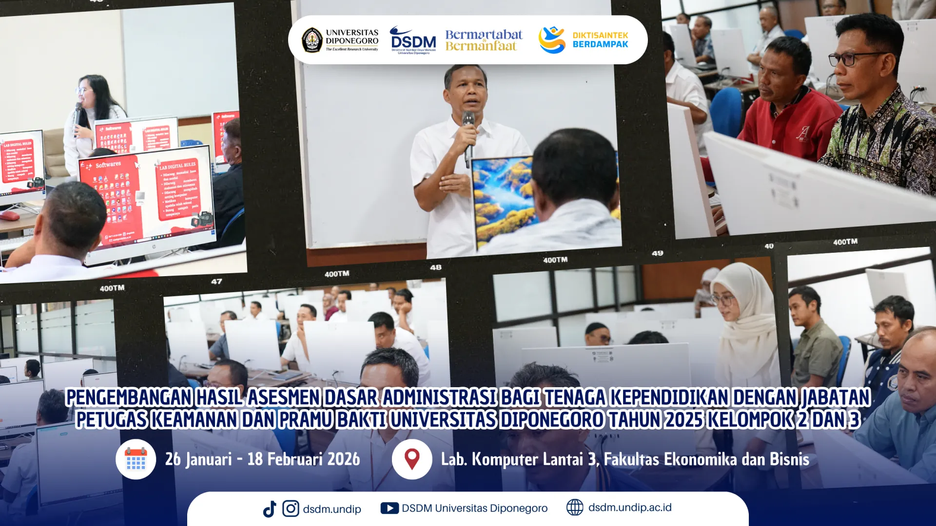 Universitas Diponegoro melalui Direktorat Sumber Daya Manusia (DSDM) kembali menyelenggarakan kegiatan Pengembangan Hasil Asesmen Dasar Administrasi Tahun 2025 bagi tenaga kependidikan dengan jabatan petugas keamanan dan pramu bakti. Program ini merupakan lanjutan dari asesmen yang telah dilaksanakan sebelumnya dan ditujukan bagi kelompok 2 dan 3.